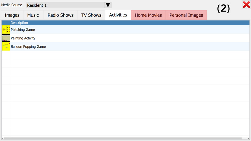 From the "Media Source" drop-down menu, select a profile to load the resident's content (Picture 1). Two additional tabs will appear on the screen (Picture 2) to give access to a resident's personal pictures and videos. Click on any of the media content tabs and select a title from the list to play personalised music, view pictures, watch videos or (as shown in the example below) play an activity (Picture 3).
