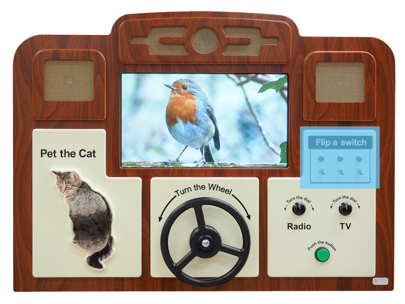 Switch 2 - Activates and displays the ABBY Matching game on the main screen for the resident to play. The matching Game is Resident personalisable. Promps can be individually recorded to include the resident's name, or even in their touge language. Images used to play the game can also be personalized to the resident's interesets to make the matching more fun and successuful.