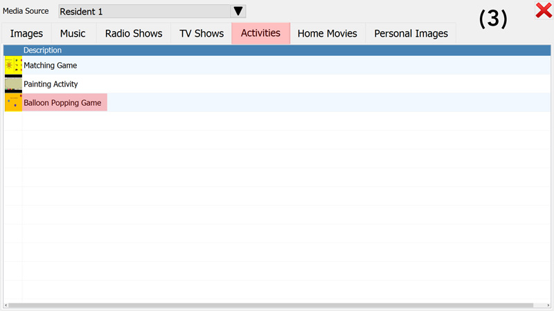 From the "Media Source" drop-down menu, select a profile to load the resident's content (Picture 1). Two additional tabs will appear on the screen (Picture 2) to give access to a resident's personal pictures and videos. Click on any of the media content tabs and select a title from the list to play personalised music, view pictures, watch videos or (as shown in the example below) play an activity (Picture 3).