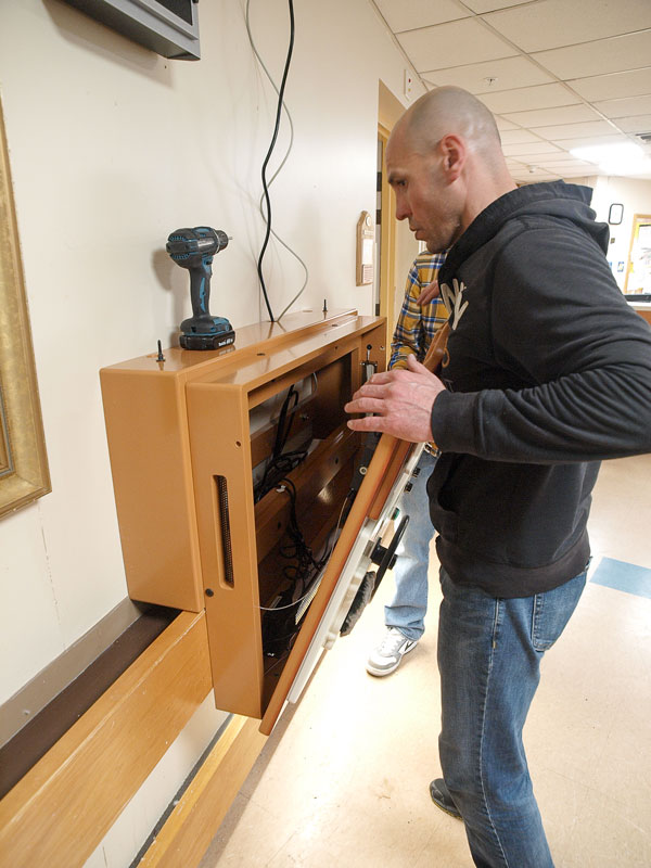 In some situations, ABBY is plugged into power and internet connections provided from above the ABBY unit, either on the wall, or into the ceiling. In other situations, ABBY is plugged into power and internet from outlets on the wall below ABBY. In some situations, it is both. Wherever these outlets are to be positioned, they not to be covered by ABBY, and should be accessible to service staff.